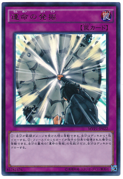 (1): 我方受到戰鬥傷害時才能發動。 從牌組抽1張牌。 (2): 場上的此卡被對手的卡片效果破壞的場合可以發動。 依據我方墓地的「命運的發掘」的數量從牌組抽牌。