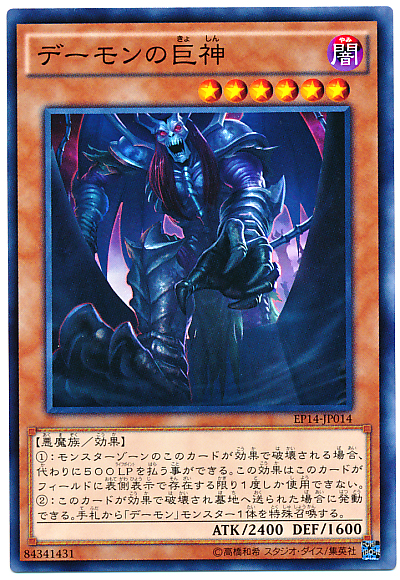 (1)此卡表側表示存在怪獸卡區為限,若此卡將被卡片效果破壞,可以支付生命值500分來代替。此效果在此卡表側表示存在場上為限只能適用1次。 (2)此卡被卡片效果破壞並送入墓地的場合可以發動。從我方手札特殊召喚1體「惡魔」之名的怪獸。