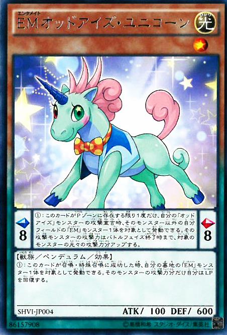 擺動刻度:左8右8 擺動效果: 此卡於擺動區域存在僅1次,我方的「異色眼」之名的怪獸的攻擊宣言時,可以我方場上除該怪獸以外的1體「EM」之名的怪獸為對象發動。 到戰鬥階段結束以前該攻擊怪獸的攻擊力上升對象怪獸的原攻擊力數值。 怪獸效果: 此卡召喚、特殊召喚成功時,可以我方墓地1體「EM」之名的怪獸為對象發動。 我方生命值回復該怪獸的攻擊力數值。