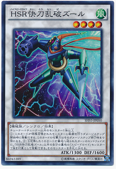協調+協調以外的怪獸1體以上 (1): 此卡和以特殊召喚的方式出場的怪獸進行戰鬥的傷害步驟開始時發動。 到傷害步驟結束以前此卡的攻擊力變為2倍。 (2): 以同步召喚的方式出場的此卡被送入墓地的回合的結束階段時,可以我方墓地1體「HSR快刀亂破拼圖」以外的「SR」之名的怪獸為對象發動。 該怪獸加入手札。
