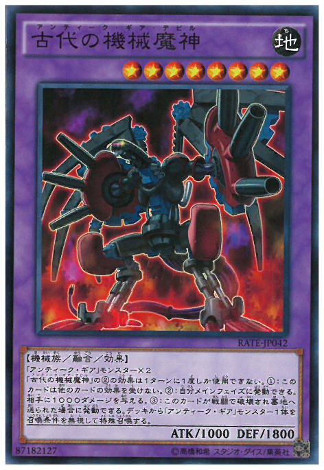 「古代的機械」之名的怪獸×2「古代的機械魔神」的(2)效果1回合僅能使用1次。(1):此卡不受其他卡片效果影響。(2):我方的主要階段時可以發動。給予對手1000分傷害。(3):此卡被戰鬥破壞並送入墓地的場合可以發動。從牌組將1體「古代的機械」之名的怪獸無視召喚條件特殊召喚。
