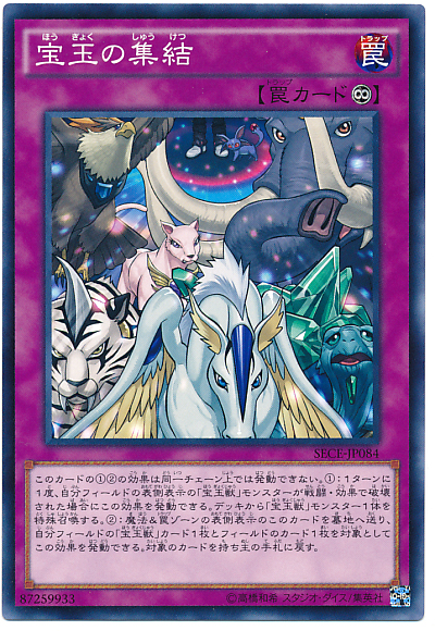 此卡的(1)(2)效果不能在同一個連鎖上發動。 (1): 1回合1次,我方場上表側表示的「寶玉獸」之名的怪獸被戰鬥、卡片效果破壞的場合可以發動此效果。 從牌組將1體「寶玉獸」之名的怪獸特殊召喚。 (2): 可以將魔法&陷阱區域的表側表示的此卡送入墓地,以我方場上1張「寶玉獸」之名的卡片以及場上1張卡片為對象發動。 對象卡片返回持有者手札。