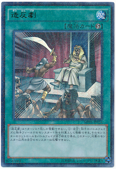 「造反劇」1回合僅能發動1張。 我方、對手的戰鬥階段時以對手場上1體怪獸為對象才能發動。 到戰鬥階段結束以前得到該怪獸的控制權。 此回合,對象怪獸以外的我方怪獸不能攻擊。