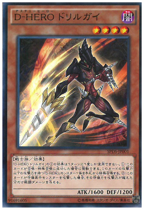 「D-HERO鑽頭小子」的(1)效果1回合僅能使用1次。<br/>(1):<br/>此卡召喚、特殊召喚成功的場合可以發動。<br/>從手札將1體攻擊力在此卡攻擊力以下的「D-HERO」之名的怪獸特殊召喚。<br/>(2):<br/>此卡向守備表示怪獸進行攻擊的場合,給予該攻擊力超過守備力的數值的戰鬥傷害。