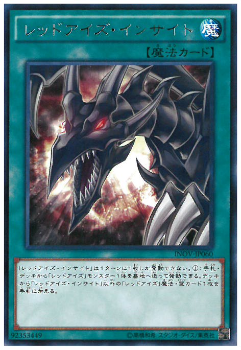「真紅眼洞悉」1回合僅能發動1張。<br/>從手札、牌組將1體「真紅眼」之名的怪獸送入墓地可以發動。<br/>從牌組將1張「真紅眼洞悉」以外的「真紅眼」之名的魔法、陷阱卡加入手札。