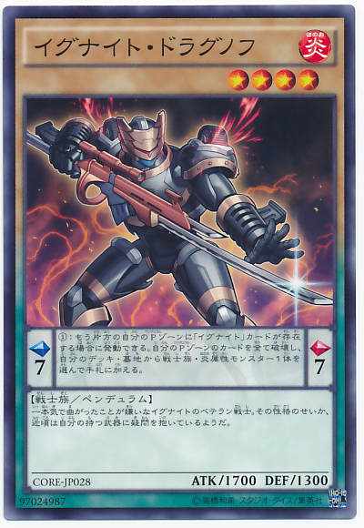 擺動刻度:左7右7<br/>擺動效果:<br/>我方主要階段時,若我方另一邊的擺動卡區存在「燧騎士」之名的卡片則可以發動。我方擺動卡區的卡片全部破壞,若全部破壞則從我方牌組.墓地將1體炎屬性.戰士族怪獸加入手札。