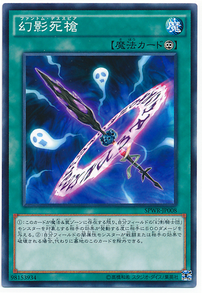 (1): 此卡於魔法&陷阱區域存在為限,每當對手發動以我方場上的「幻影騎士團」之名的怪獸作為對象的卡片效果就給予對手500分傷害。 (2): 我方場上的闇屬性怪獸被戰鬥或是對手的卡片效果破壞的場合,可以將墓地的此卡除外作為代替。